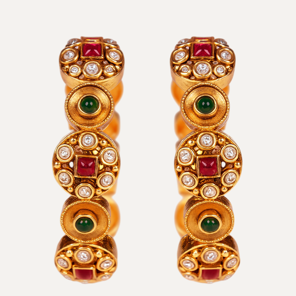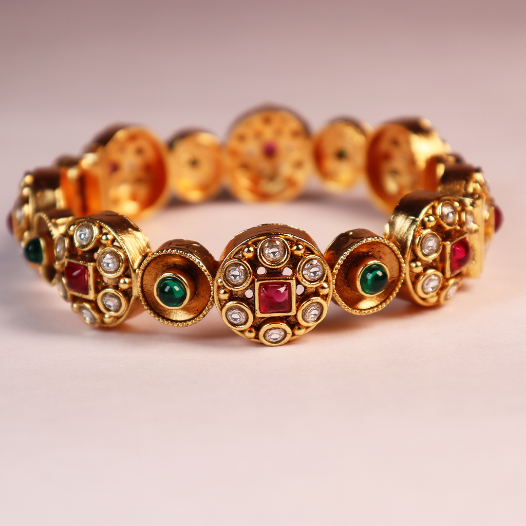 Designs: Discover a diverse selection of bangle designs, from classic and timeless to modern, royal and chic. Our collection includes plain, engraved, gemstone-studded, and intricate filigree designs, ensuring there's something for every style.