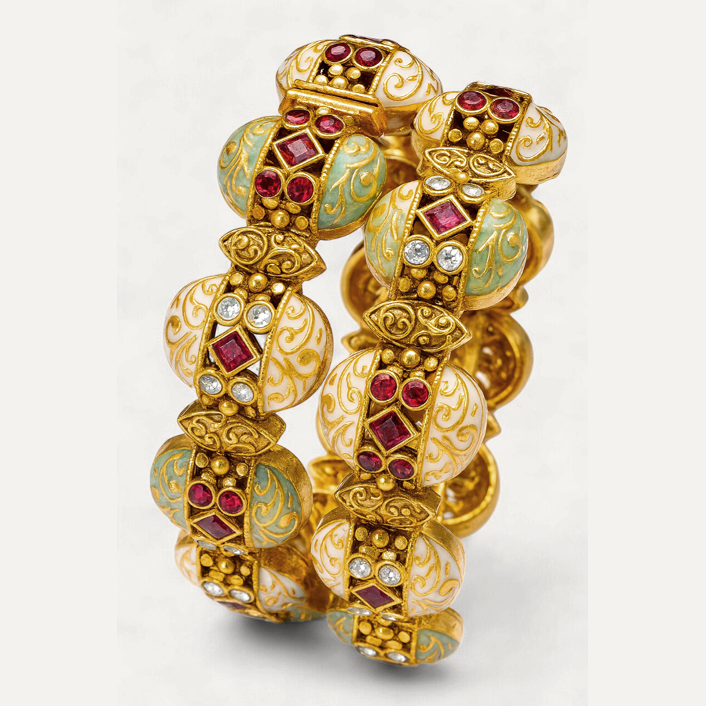 2. Designs: Discover a diverse selection of bangle designs, from classic and timeless to modern, royal and chic. Our collection includes plain, engraved, gemstone-studded, and intricate filigree designs, ensuring there's something for every style.
