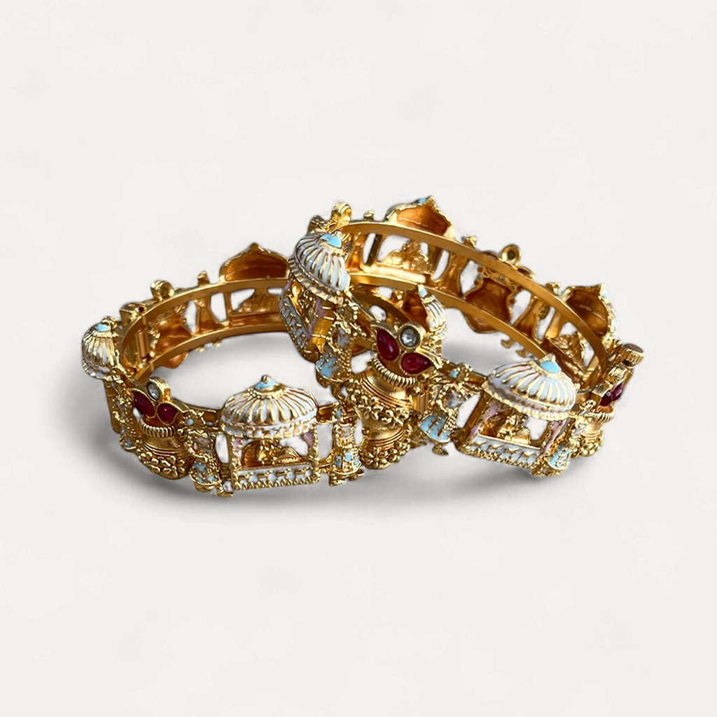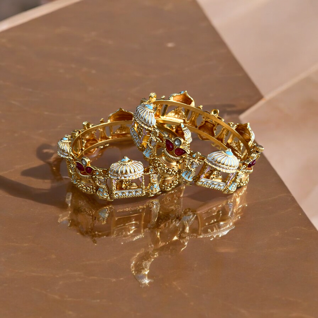 Designs: Discover a diverse selection of bangle designs, from classic and timeless to modern, royal and chic. Our collection includes plain, engraved, gemstone-studded, and intricate filigree designs, ensuring there's something for every style.