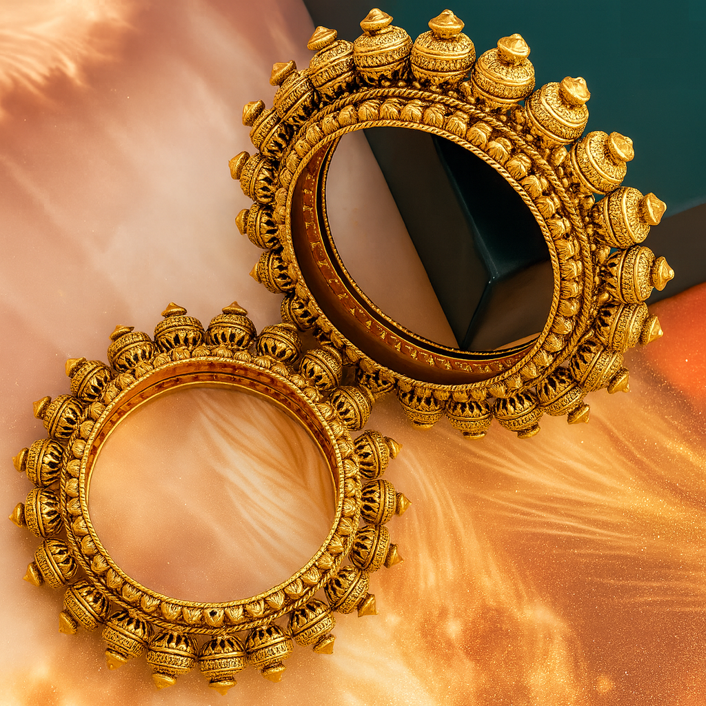 Designs: Discover a diverse selection of bangle designs, from classic and timeless to modern, royal and chic. Our collection includes plain, engraved, gemstone-studded, and intricate filigree designs, ensuring there's something for every style.