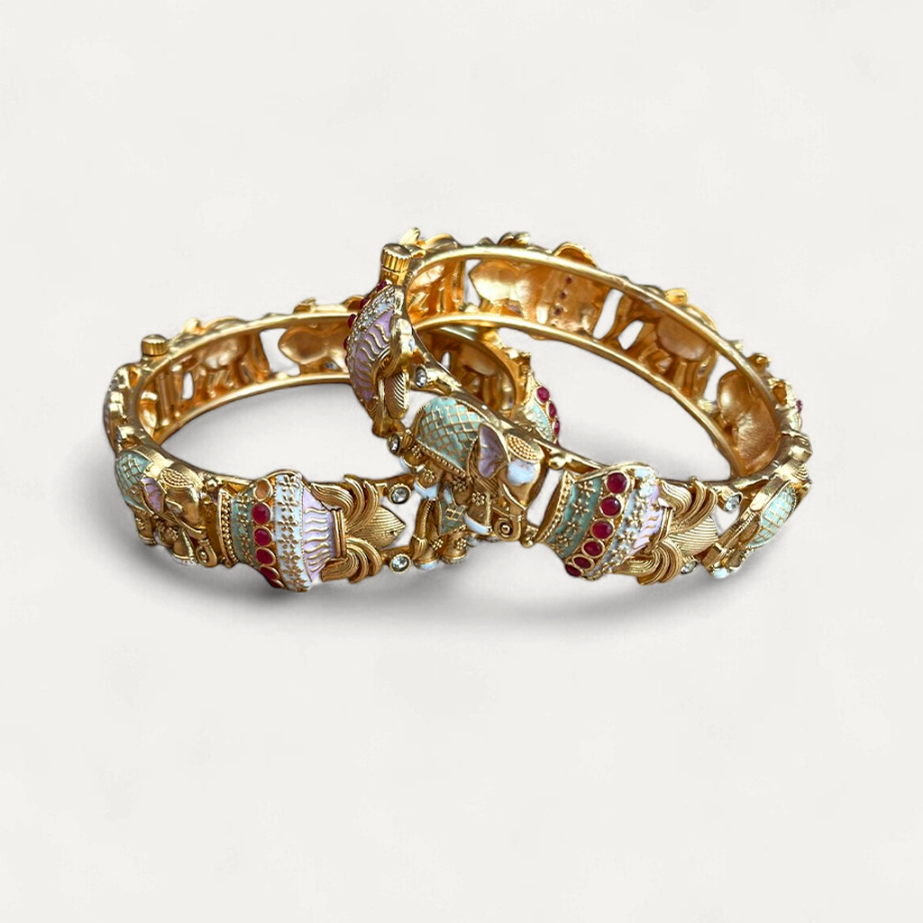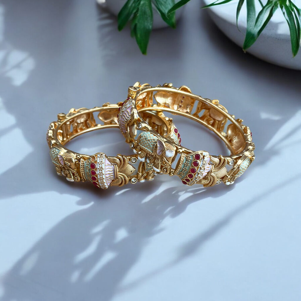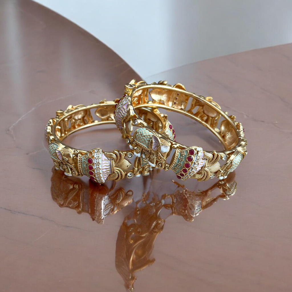 Designs: Discover a diverse selection of bangle designs, from classic and timeless to modern, royal and chic. Our collection includes plain, engraved, gemstone-studded, and intricate filigree designs, ensuring there's something for every style.