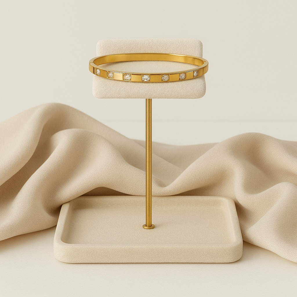 Crafted with a sleek, minimal design, this bangle features a row of precisely set shimmering stones, offering just the right touch of sparkle. Its polished gold-tone finish adds a hint of luxury to your wrist without being too loud — perfect for women who appreciate quiet elegance.